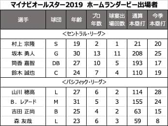 今年の出場者は、セ・リーグから村上宗隆(東京ヤクルト)、坂本勇人(読売巨人)、筒香嘉智(横浜DeNA)、鈴木誠也(広島東洋)、パ・リーグから山川穂高(埼玉西武)、レアード(千葉ロッテ)、吉田正尚(オリックス)、森友哉(埼玉西武)の計8人となった。