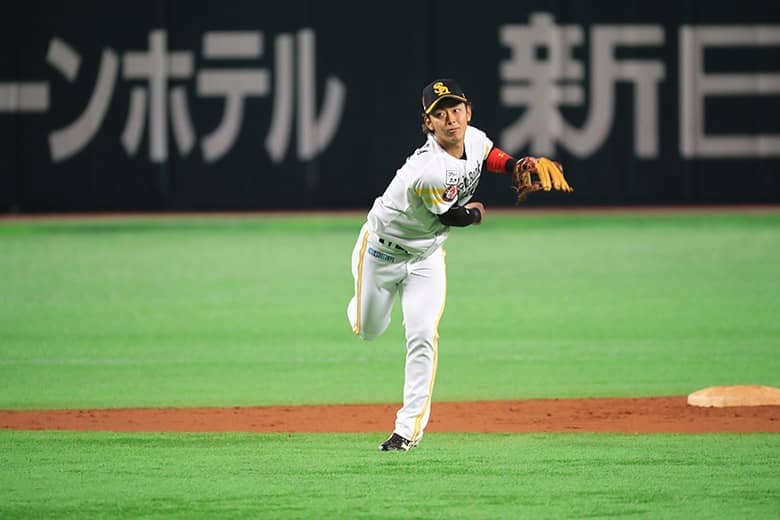 ドラフト1位指名を受け、高校卒業後にソフトバンクへ入団した今宮は、投打二刀流からショートとして野手一本に絞った。高校時代は通算62本塁打のスラッガーだったが、身長172㎝と小柄だったこともあり、プロ入り後は小技に生きる道を選ぶ。プロ3年目の2013年にはショートのレギュラーをつかみ、パ・リーグのシーズン最多記録を塗り替える62犠打をマーク。翌年も同じく62犠打を記録し、つなぎ役としての地位を確立し、通算犠打数は現役最多を誇っている。ショートの守備も球界トップクラスで、三遊間の深いゴロに飛びつき、瞬時の大遠投でアウトにするシーンは最大の見せ場で、まさに"今宮タイム"だ。昨年こそ故障続きで受賞を逃したが、2013~2017年まで5年連続でゴールデングラブ賞に輝いている。