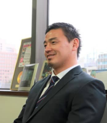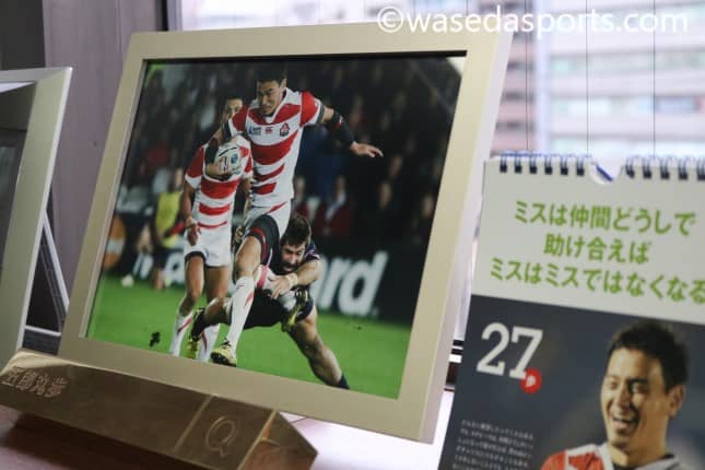 事務所には15年のW杯にてタックルを振り切る五郎丸選手の写真が飾ってありました