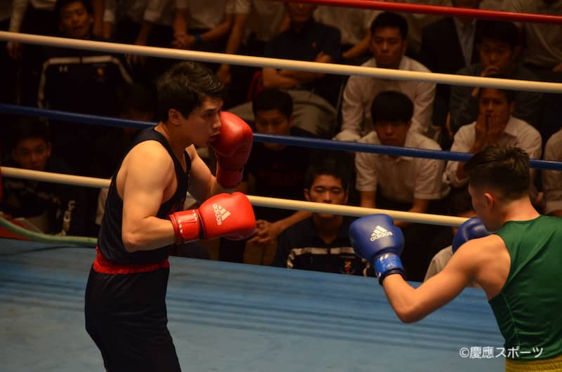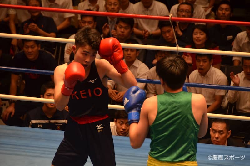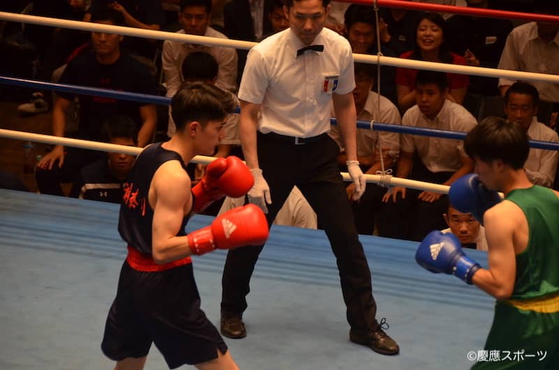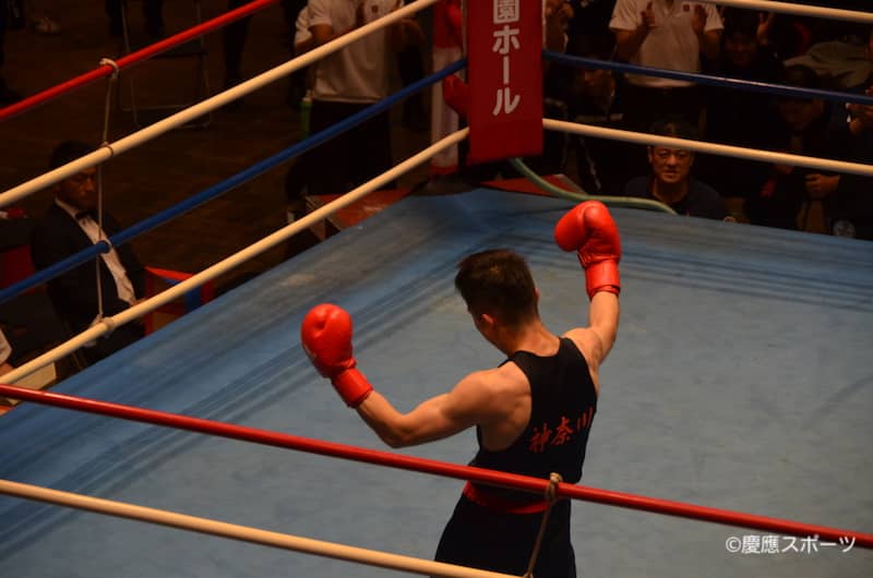続く二戦目はフライ級の桑満隆生(文3・慶應)の登場。試合は序盤から激しい打ち合いへ展開したが、この流れを変えたのは桑満の強力なストレート。流れに乗った桑満は2R後半に相手からダウンを奪うなど試合の主導権を握る。相手のパンチも上手くガードしつつ、3Rに奪った二度目のダウンが決定打となり、5-0で勝利した。