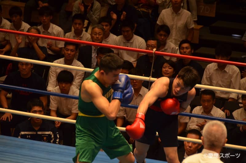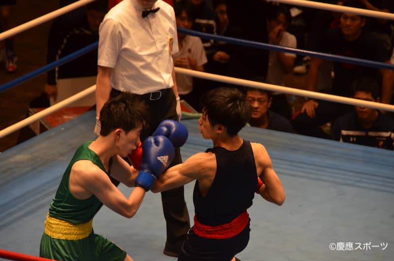 慶大勝利まであと1勝。ライト級を戦うのは松木健太(総1・鎌倉学園)。1Rでは相手のボディなどに苦戦し攻めきれなかったが、2Rには逆に松木の攻撃が優勢となる両者互角な展開となった。しかし、松木に疲労が見え始めた3R。粘り及ばず1-4と、接戦の軍配は相手に上がった。