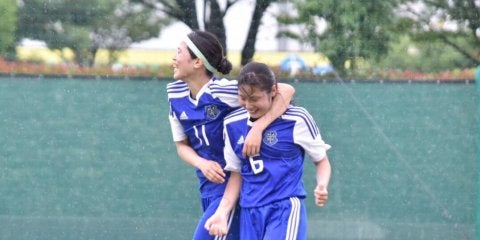 <写真・得点を決め、喜ぶ岡(右)と渡邉> 7月14日、神戸レディースフットボールセンターにて、令和元年年度兵庫県女子サッ…