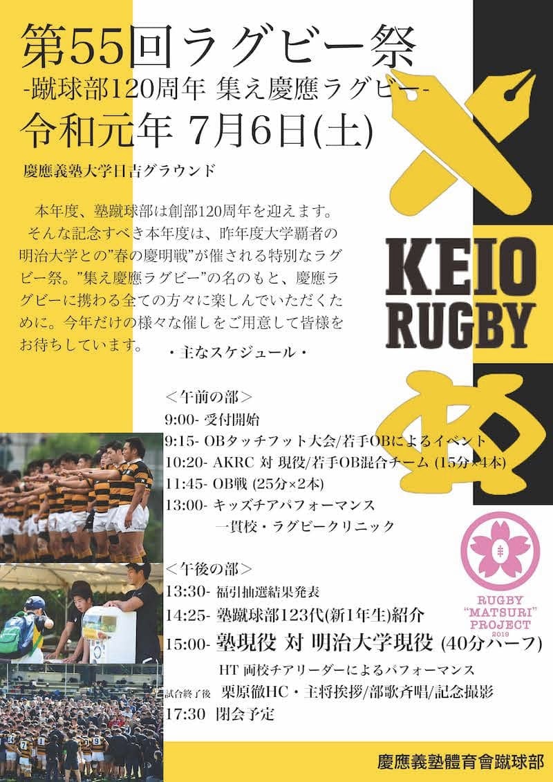 第55回ラグビー祭が7月6日(土)に行われた。今年は明治大学Aチームと「春の慶明戦」が行われることもあってか、多くの来場者が訪れた。