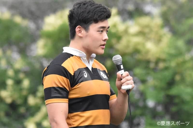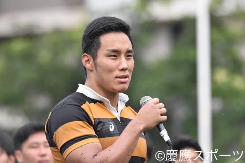 「本日はお足元の悪い中、ラグビー祭にお越しいただきありがとうございました。春シーズンはご覧の通り、あまり満足する結果にはいかず、悔いの残ってしまうような春だったのですが、この夏しっかりとその課題をもって秋のシーズンに必ず日本一がとれるように努力してまいりますので、引き続き応援のほどよろしくお願いいたします。」