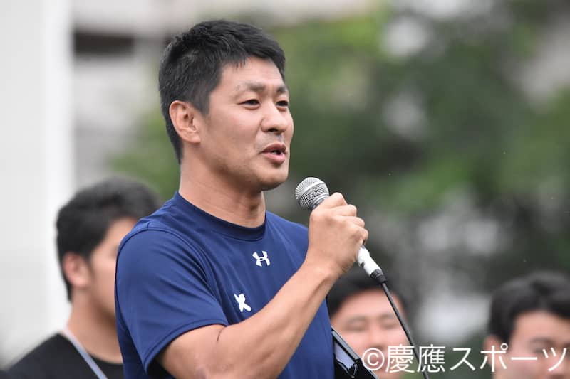 「皆様いつも温かいご声援ありがとうございます。今日も天候が不安定な中、多くの方に来ていただいて、声援を送っていただいて、本当に選手にとって勇気づくサポートありがとうございます。試合の方はご覧の通りの点数ですけど、選手は一生懸命頑張ってくれました。この(明治大との)差とは私と田中監督との差だと思っていますので、しっかり自分も勉強し直しまして、夏、秋に向けて明治に対してリベンジができるよう、チーム一丸となってまいりますので今後とも変わらぬ熱い、温かい応援、ご支援よろしくお願いいたします。本日はありがとうございました。」