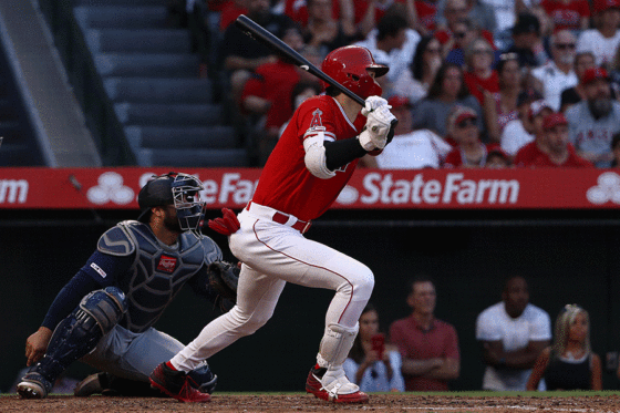 5回無死満塁での第3打席で2番手の元ヤクルトのカラシティーと対峙し、左翼への同点犠飛を放つと、第4打席でようやく快音を響かせた。前日は元西武のウェイド・ルブラン投手の前にノーヒットに終わっていた大谷だったが、日本ハムでチームメートだったアンソニー・バース投手から一塁強襲の内野安打を放ち、2試合ぶりの安打とした。