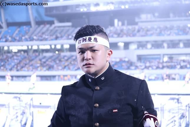 「集大成だったね」と言う言葉ですかね。僕が1年生の時に(応援部に)入った理由が、早慶サッカーを応援したいということと、武田太一(スポ4=ガンバ大阪ユース)を応援して勝たせたいという2つの理由があったんです。2年生の時は部内で風邪が流行ってしまって、自分は当日に39度くらい(の熱が)出てしまい、先輩に帰れと言われて帰らされてしまったんです。その時は、来年こそは俺が応援して、当番として応援をまとめると決心しました。それで3年生の早慶サッカーで(武田に)、「お前は点を取ってくれ」と言ったんです。それで1点ビハインドの中、武田が2点を取ってくれて勝ったんです。今年、武田は膝を怪我して出られませんでしたけど、その分自分が戦おうと思ってやってきました。そうしたら、ハーフタイム中に武田が俺のところに来てくれて、「去年俺が勝たせたんだから、今年はお前が勝たせろ」と言われました。最後はずっと試合を観ていたんですけど、そしたら最後FW加藤拓己 (スポ2=山梨学院)君がヘディングして、ゴールキーパが触ったけどゴールに吸い込まれていった時には、もう崩れ落ちましたね。…崩れ落ちてね、もう最高ですね!ということで、集大成と言われたことがすごく嬉しかったですね。