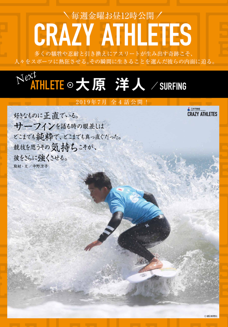2019年7月、全4話で構成される「三井不動産 Presents CRAZY ATHLETES 大原洋人」。この密着企画では、彼の競技人生から一部が切り取られ、壮絶なサーフィン人生の裏側も明かされる。