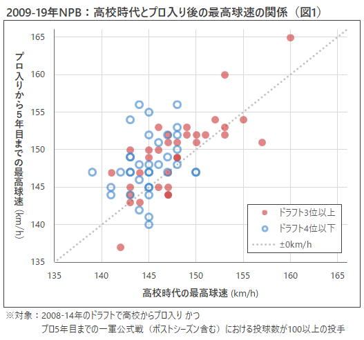 図1は、分離ドラフトが廃止された2008年から14年のドラフトで指名された高校生を対象とした、高校時代とプロ入り後の最高球速の関係を示している。プロ入り後のデータは5年目までを区切りとし、ポストシーズンを含む一軍公式戦で計測された最高球速を用いた。