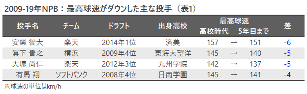 これを見ると、大半の点は左上のエリアにプロットされていて、多くの投手がプロ入り後に高校時代の最高球速を更新したことが分かる。安樂智大(現楽天)や眞下貴之(元DeNA)など、故障やフォーム改造をきっかけに球速が落ちてしまった例もあるが(表1)、一般的には20代前半が球速の伸び盛りであることが、この図からも確認できる。