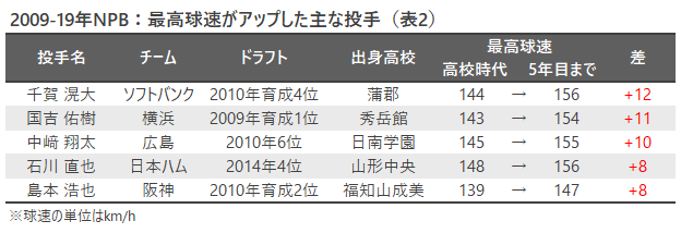 一方、プロ入り後の最高球速を見ると、155キロ前後を記録した下位指名の投手が目立つ。特に、千賀滉大(現ソフトバンク)と国吉佑樹(現DeNA)はともに育成ドラフトで入団し、高校時代から10キロ以上のスピードアップに成功(表2)。