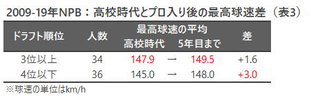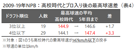 ドラフト順位の分類に沿って、高校時代とプロ入り後の最高球速の平均を算出したのが表3だ。3位以上は高校時代に速球で鳴らした投手が多い分、プロ入り後の最高球速でも4位以下のそれを上回っている。