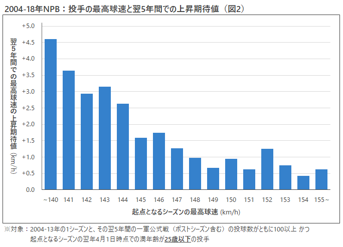 そこで、最高球速と伸びしろの関係を見ていきたい。図2は、2004年から昨年までのNPBにおいて、「あるシーズンにある最高球速を記録した投手は、翌5年間でその最高球速が何キロアップするか」をグラフにしたものだ。