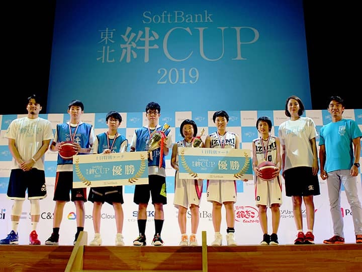 『SoftBank 東北絆CUP』は東日本大震災で津波被害を受けた岩手県、宮城県、福島県の沿岸部地域の小中学生に、スポーツや文化活動を楽しむ機会を提供するイベントで、バスケットボール、野球、サッカー、自転車、卓球、吹奏楽を対象にソフトバンクが主催する。そのバスケットボール種目の大会が7月14日、岩手県陸前高田市の夢アリーナたかたを舞台に行われた。