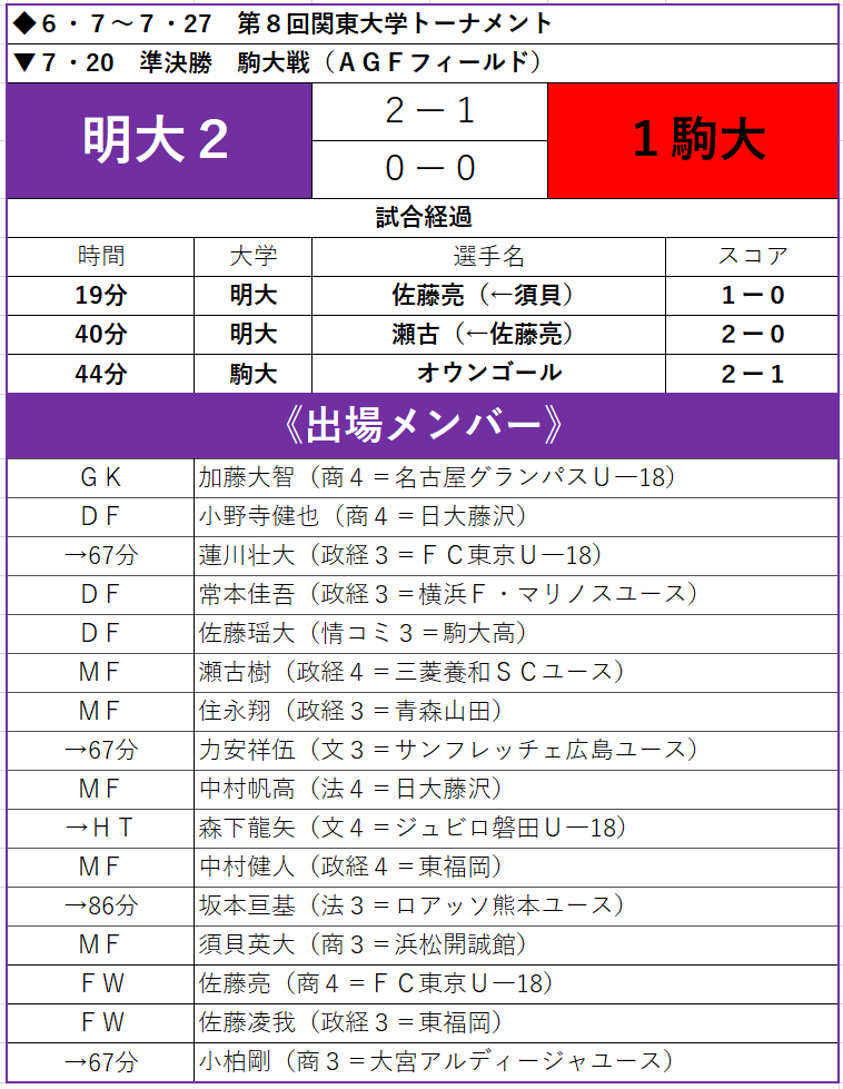 準決勝は駒大との一戦。今季2戦2勝と相性の良い相手だ。立ち上がりから主導権を奪い、攻め上がりを見せた。前半19分には主将・佐藤亮が先制点を挙げ、前半40分に追加点。前半終了間際にオウンゴールを喫したが、最後まで守り抜き2―1で勝利。決勝戦進出を決めた。