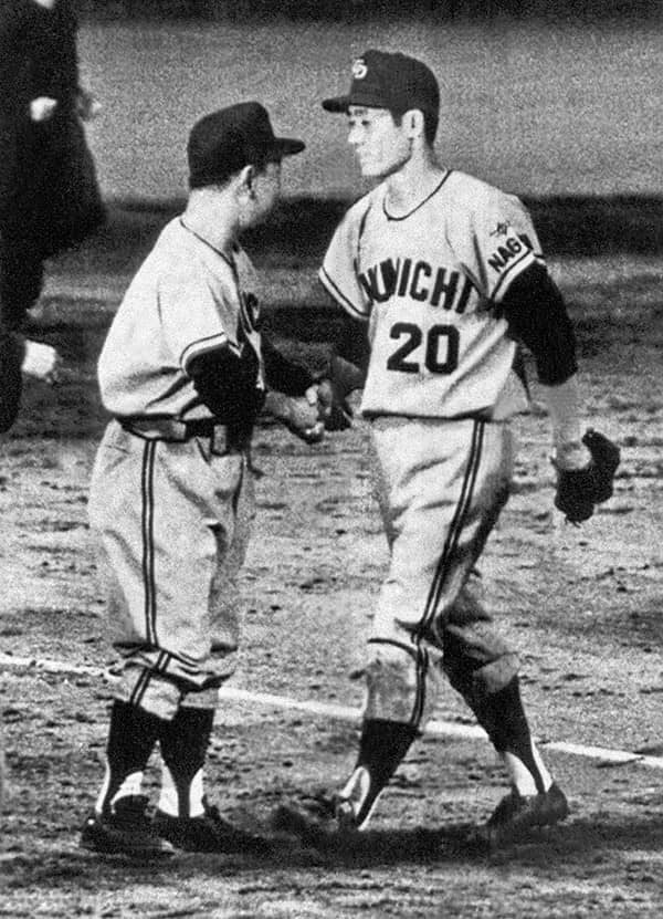 1961年10月7日、シーズン34勝目を挙げた権藤博を濃人渉監督が出迎える