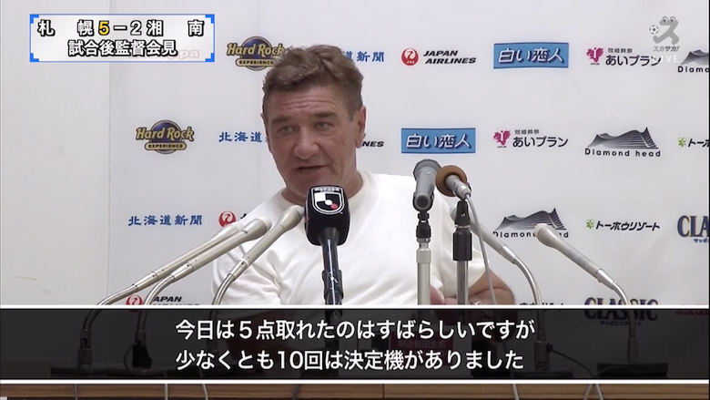 4試合ぶりの勝利を上げた札幌のミハイロ・ペトロヴィッチ監督は「5得点を取れたのは素晴らしいが、少なくとも10回は決定機があった。その部分を忘れてはいけない」と、大勝しながらも課題を口にした。