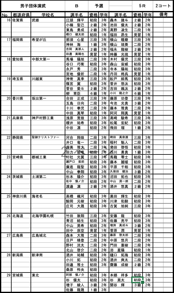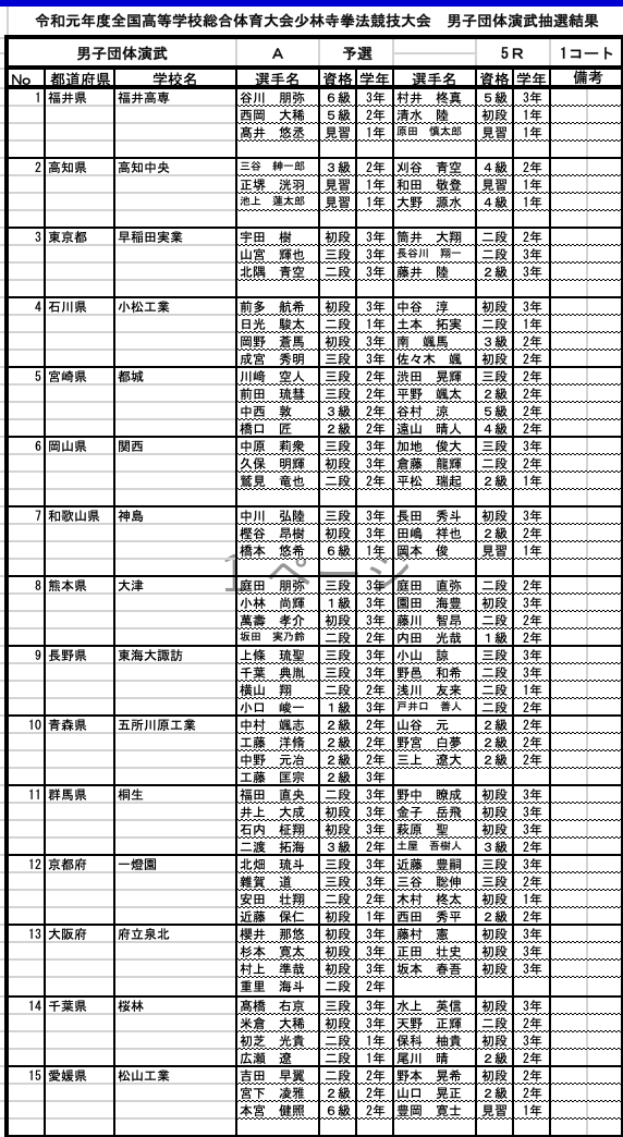 少林寺拳法(男子)組み合わせ/南部九州高校総体インターハイ2019