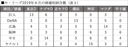 その観点も踏まえて今季の8月の試合日程を見ると、阪神は京セラドーム大阪で6試合を行うほか、東京ドームとナゴヤドームで3試合ずつを実施。8月の27試合中12試合をドーム球場で行う予定となっている。この日程だと、暑さのダメージを軽減し、体力の消耗を防ぐことできるはずだ。(表3&表4&表5)