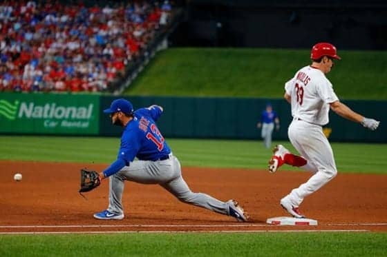 両チーム無得点で迎えた3回だった。カージナルスは先頭ウィータースがライトへの二塁打で出塁。続くマイコラスがバントすると、遊撃のバエスが処理。ギリギリのタイミングで送球はワンバウンドとなり、ベースカバーに入ったボートはすくい上げることができず、ボールは後ろに逸れた。ウィータースの三塁進塁はバエスの送球エラーが記録された。