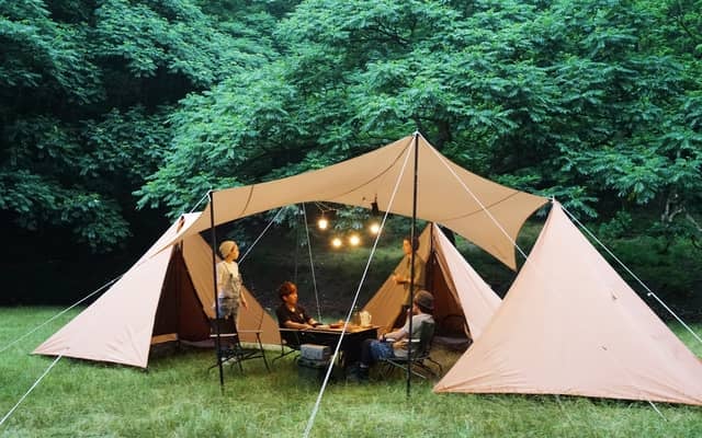 「チマキテント」は、寝室は別々、リビングは一緒に使用するシェアハウススタイルの大人2名用テントだ。チマキテントをタープテントのポールに引っ掛け、ペグで固定するだけで設営が完了し、 簡単にシェアハウススタイルが完成する。