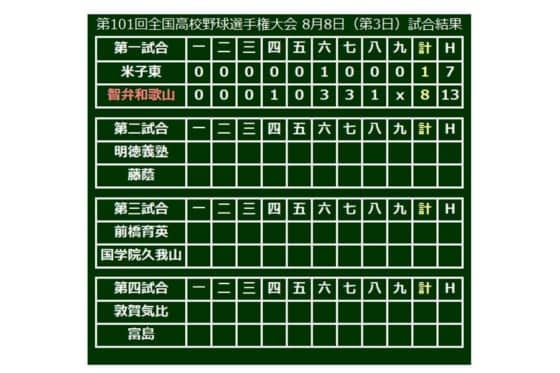 第101回全国高校野球選手権大会の3日目が8日、甲子園で行われ、第1試合は3年連続24回目の出場となった智弁和歌山(和歌山)が8-1で28年ぶり14回目の出場となった米子東(鳥取)を下し2年ぶりの初戦突破となった。