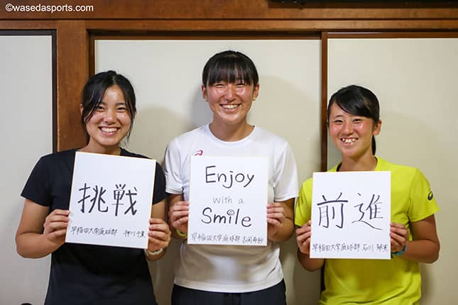 今年度の早慶対抗試合、ルーキーながら出場を果たした石川琴実(社1=神奈川・白鵬女子)、押川千夏(社1=福井・仁愛女子)、吉岡希紗(スポ1=三重・四日市商)の3人。高校時代から華々しい戦績を収め、早大に入学した期待のルーキーに初挑戦となる全日本学生選手権(インカレ)へ向けた意気込みを伺った。