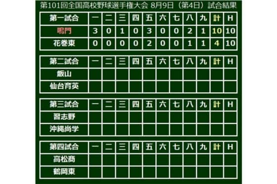 第101回全国高校野球選手権大会の4日目が9日、甲子園で行われ、第1試合は2年連続13回目の出場となった鳴門(徳島)が10-4で2年連続10回目の出場となった花巻東(岩手)を下し3年ぶりに初戦を突破した。