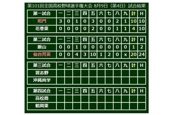 第101回全国高校野球選手権大会の4日目が9日、甲子園で行われ、第2試合は3年連続28回目の出場となった仙台育英(宮城)が20-1で初出場の飯山(長野)に大勝し、初戦を突破した。