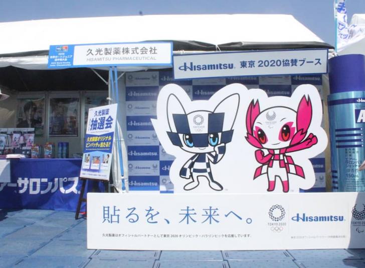 また久光製薬株式会社ブースでは2020年東京五輪・パラリンピック公式マスコット「ミライトワ」「ソメティ」パネルと共に写真撮影することができ、久光製薬オリジナルピンバッチが当たるお楽しみ抽選会も行われている。