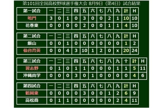第101回全国高校野球選手権大会は9日、1回戦4試合が行われた。鳴門(徳島)、仙台育英(宮城)、習志野(千葉)、鶴岡東(山形)がそれぞれ勝って、2回戦に進出した。