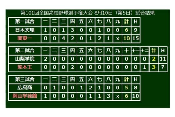 第101回全国高校野球選手権大会第5日は、甲子園球場で1回戦2試合、2回戦1試合が行われ、関東一(東東京)、熊本工(熊本)が2回戦に、広島商(広島商)が3回戦に進出した。