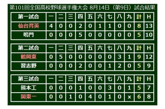 第101回全国高校野球選手権大会第9日は、甲子園球場で2回戦3試合が行われ、仙台育英(宮城)、鶴岡東(山形)、関東一(東東京)が3回戦に進出した。これで3回戦に進出する16校が出揃った。15日は台風10号の接近に伴って全試合順延。3回戦は16、17日に行われる。