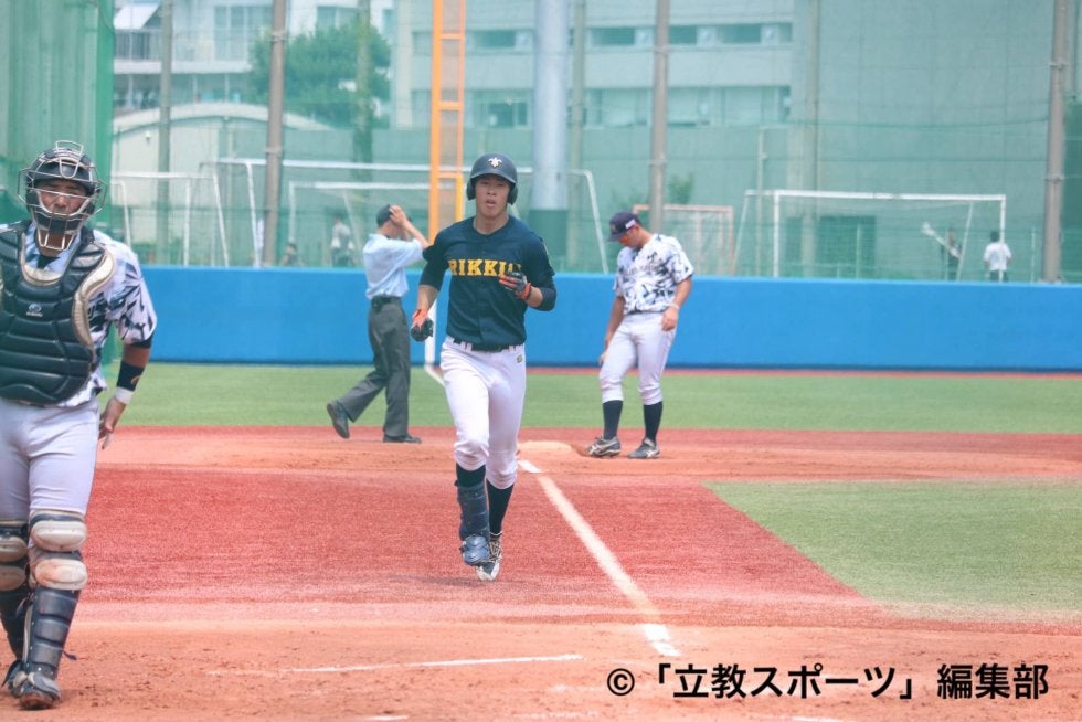 8回に待望の追加点を取る。一死二塁で、打者は投手の手塚。ベンチからの大きな声援を背に、フルスイング。右中間を破る適時三塁打を放つ。手塚も安堵(あんど)の笑みを浮かべた。途中出場の伊藤智(コ3=高田)も右翼線ギリギリの適時二塁打の連打で続き、この回2点を獲得。相手を突き放した。