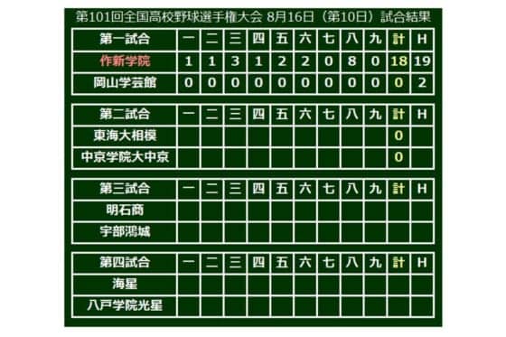 第101回全国高校野球選手権大会第10日目が16日、阪神甲子園球場で行われ、岡山学芸館(岡山)と作新学院(栃木)が対戦。作新学院・林勇成投手が8回2死までノーヒットノーランの快投。8回2死からヒットを許し快挙達成はならなかったものの、18-0と大勝して全国制覇した2016年以来の準々決勝進出を決めた。