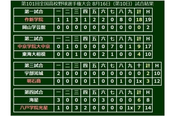 第101回全国高校野球選手権大会第10日は、甲子園球場で3回戦4試合が行われ、作新学院(栃木)、中京学院大中京(岐阜)、明石商(兵庫)、八戸学院光星(青森)が準々決勝進出に進出した。