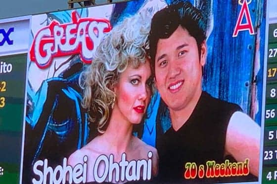 初回、大谷は無死一、二塁で打席へ。先発右腕ジオリートに2球で追い込まれると、内角への95マイル(約153キロ)の直球にバットが空を切り、空振り三振に倒れた。この日は「’70s WEEKEND」と名付けられた1970年代をフィーチャーしたイベントで、ユニフォームも当時のものを着用。スクリーンには1970年代の映画に選手をコラージュした写真が使われ、大谷は1978年公開の「グリース」のジョン・トラボルタに合成された“ショウ・トラボルタ”で登場したが、初回は凡退した。