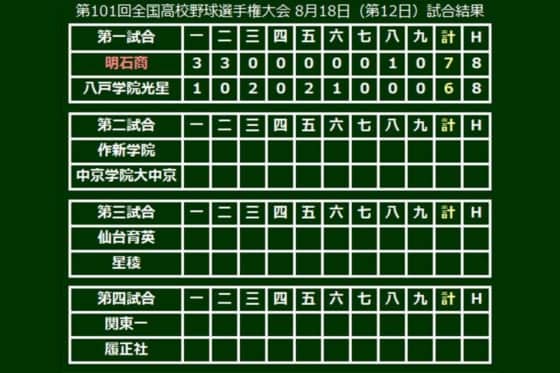 第101回全国高校野球選手権大会第12日が18日、甲子園球場で行われ、準々決勝第1試合は明石商(兵庫)が八戸学院光星(青森)を7-6で振り切り、今年の選抜に続いて2季連続で4強進出を決めた。7回途中から登板した2年生エース中森が最速151キロをマークし、終盤の八戸学院光星の反撃を断った。