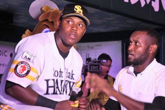 初打席初球本塁打を放ったコラスとともにお立ち台に上がったゲレーロ通訳ソフトバンク 5-4 西武(18日・ヤフオクドーム)…