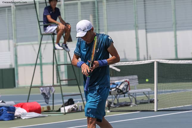 田中優 春関で結構ボコボコにされていて。3回ぐらいやって一度も勝てていなくて、相手は強いってわかっていたので、ここまできたら僕もチャレンジャーの気持ちでいくっていうのでやっていたんですけど、ファーストセットはなんとかキープをして、リターンゲームを全然取れないという状況が続いて相手が乗ってしまって、2−3からトントンといってしまったんですけど。そこで暑くて体もきつかったんですけど、落ちずに最後まで戦えたことは収穫で、シングルスは久々にいいプレーで最後までやり切れたかなと思います。今自分に出来る最大限のことはやったんじゃないかなと思います。