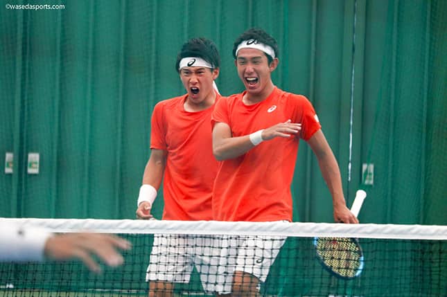 準々決勝で強敵・楠原悠介・岡垣光祐 (法大)組と対戦した田中優・木元組。ファーストセットは「サーブも良かったし、前衛もうまかったので、仕方ないといえば仕方ないんですけど、リターンでのミスが多すぎた」(田中優)と語るように、リターンゲームでチャンスを見出せず。互いに全てのゲームをキープして迎えたタイブレークを5−7で落とし、劣勢に立たされた。それでもセカンドセットでは「僕らのポジションを下げたりだとか、ロブを多めに使うことで良くなった」(田中優)とファーストセットで多く見られたリターンミスの修正を図った木元・田中優組。「リターンミスでポイントを落とすことは少なくなっていたので、チャンスは来る」(田中優)とサービスゲームを手堅くキープし続け迎えた第8のリターンゲーム。長いデュース戦の末にこの試合両ペアを通じて初めてとなるブレークを奪い、このセットをものにすると、ファイナルセットのタイブレークも10−6制した木元・田中組が見事ベスト4入りを果たした。