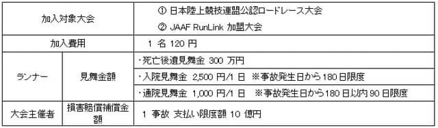 「日本陸上競技連盟ロードレース補償制度」は、日本陸連公認大会、JAAF RunLink加盟大会へ提供する共通の保険サービスだ。加入費用は、各大会と包括して契約することで1名当たり120円。事故があった際、ランナーには入院見舞金や死亡後遺見舞金などが支払われる。