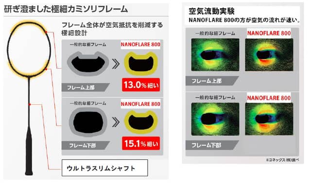 「NANOFLARE 800」は、上級者からの支持が厚い振り抜きの良さを追求したバドミントンラケットだ。あらゆる角度での空気抵抗を削減した「極細カミソリフレーム」を採用し、上級者が求める振り抜きの良さを実現。一般的な細型のフレームと比較して、フレーム上部を13.0%、フレーム下部を15.1%細くし、空気抵抗をフレーム上部9.3%、フレーム下部11.5%削減することで、スウィングスピードを大幅に向上している。