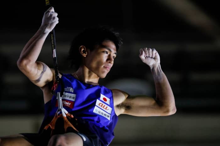 ボルダリング第2課題を完登しガッツポーズする楢崎智亜。