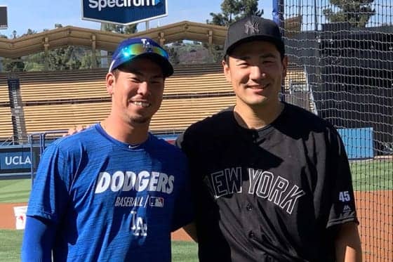 ドジャースタジアムで再会したドジャース・前田健太(左)とヤンキース・田中将大【写真:盆子原浩二】