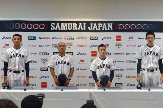 30日から韓国・機張(きじゃん)で開催される「第29回WBSC U-18ベースボールワールドカップ」に参加する高校日本代表の結団式が都内で行われ、永田裕治監督、主将の坂下翔馬内野手(智弁学園・3年)、佐々木朗希投手(大船渡3年)、奥川恭伸投手(星稜3年)が出席した。