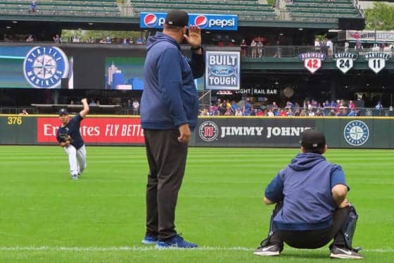 右打者を意識した投球練習を行ったマリナーズ・菊池雄星【写真:木崎英夫】
