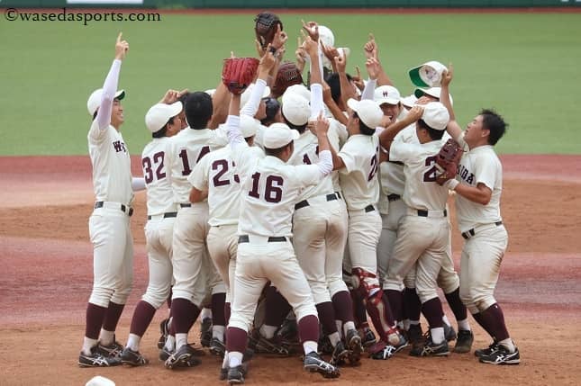 喜びを爆発させる早大ナイン