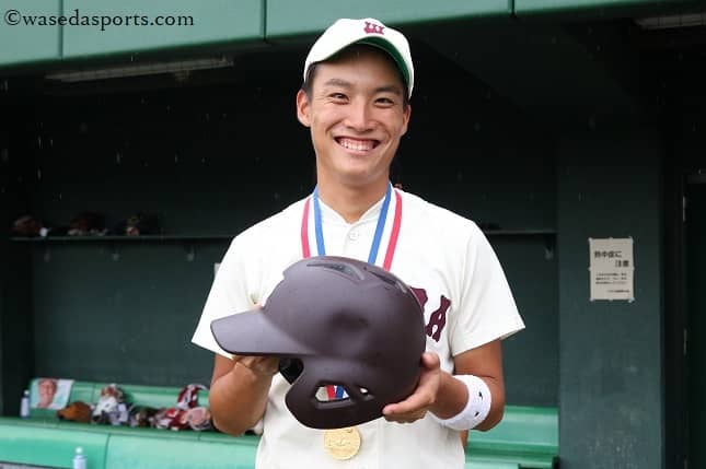 その裏に田中爽が3つの四死球などで1点を返されるが、ここも最少失点で乗り切る。すると7回にはまたも関が先頭で出塁し、その後2死一、三塁と好機が拡大。ここで吉田龍主将が左中間に2点適時二塁打を放ち、6回に取られた分を倍返しした。さらに8回には1番・池澤一真(スポ3=栃木・大田原)が出塁し、塚脇の犠打と中村康祐(教3=早稲田佐賀)の中前打で1死一、三塁に。ここで代打・竹本周平(人3=鳥取・米子東)は、今大会代打で3安打目(4打数)となる右前適時打を放つ。投げては準々決勝から三連投となった福川千明(スポ3=兵庫・白陵)が7、8回をわずか14球で零封。「大好きな4年生」(竹本)との全国制覇へ、終盤に3年生が大きな役割を果たした。