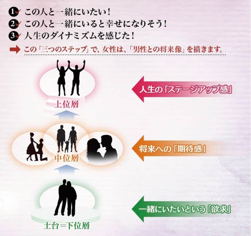中位層の「将来への期待感」とは、ご自身の夢と生き方、そして男性の場合には「実績」から見えてくる「夢の実現可能性」と「説得力」の問題になります。会社への不平不満、世の中への不平不満を撒き散らしてしまう男性には、将来の期待感は女性の心には生じません。
